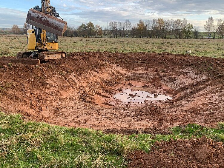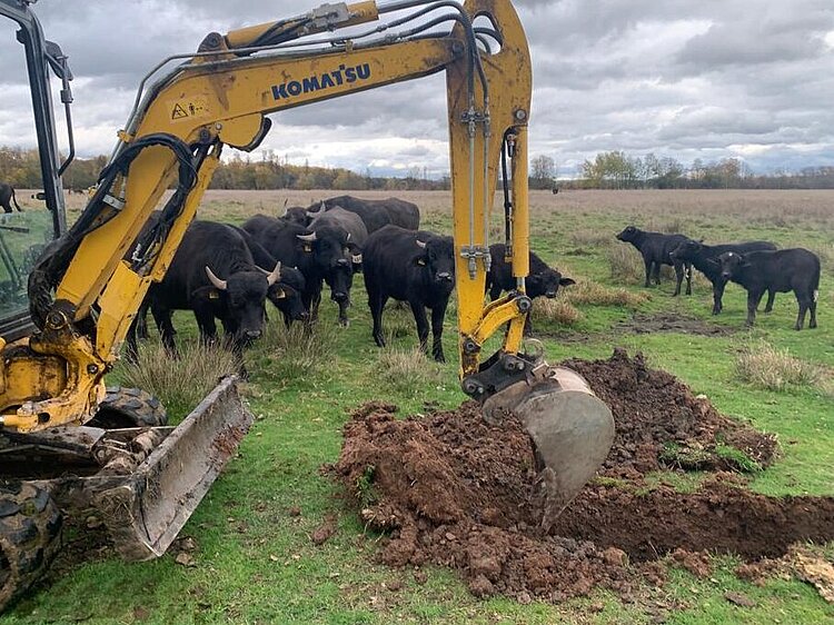 Im Naturschutzgebiet „Dankmarshäuser Rhäden“ werden derzeit Erdarbeiten durchgeführt, um neue Gewässerstrukturen für Kammmolch, Wiesenbrüter und Co. zu schaffen. Die gefährdeten Kammmolche, die aufgrund der auffälligen gezackten „Hochzeitstracht“ der Männchen an Fantasiewesen erinnern, benötigen fischfreie, besonnte Kleingewässer zur erfolgreichen Fortpflanzung. Offen gehalten werden die Gewässer zukünftig durch die Wasserbüffel, die den Bauarbeiten bereits neugierig beiwohnen.