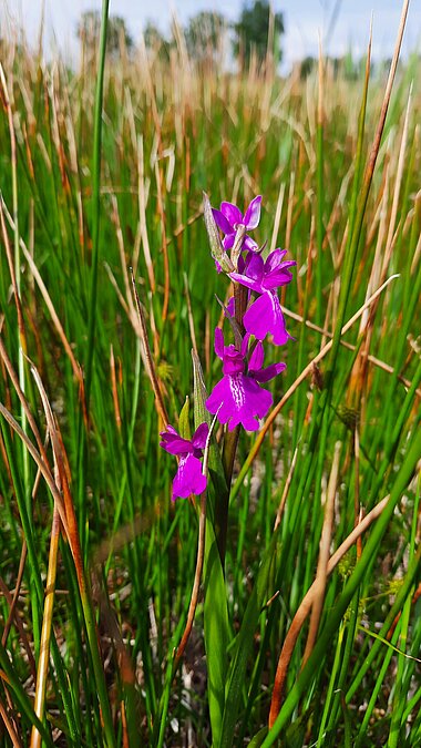 Das Haßlebener Ried ist mit dem Alperstedter Ried eines der letzten großen erhaltenen Kalkdurchströmungsmoore im Thüringer Becken – etwas ganz Besonderes also und über Thüringen hinaus bekannt. Daher sind auch die Lebensraumtypen und Arten, die dort vorkommen europaweit durch die Flora-Fauna-Habitat-Richtlinie (FFH) geschützt. Hier kommen sehr seltene Arten, wie z.B. das Sumpf-Knabenkraut, als eine von fünf Orchideenarten vor. Wie viele gefährdete Arten ist auch diese Orchidee nicht besonders konkurrenzstark, so dass es wichtig ist, dass der Aufwuchs nicht zu dicht wird. Wie der Name schon sagt, ist ein Durchströmungsmoor mit seinen seltenen Arten von Quelltöpfen und einem hohen Wassergehalt geprägt, was die Pflege besonders herausfordernd macht.