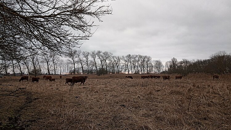 Drittens steht auch jetzt im Februar noch genug Futter auf der Weide, auch wenn die Flächen, in denen sich die Tiere vorwiegend im Sommer aufhalten, schon sehr kurz gefressen sind. Nun lässt sich gut von den Aussichtseinrichtungen beobachten, dass die Tiere vermehrt von den Kernflächen fressen, die für den Naturschutz besonders wichtig sind. Auch sie dürfen jetzt noch abgefressen werden, damit im Frühjahr konkurrenzschwache und daher seltene Arten, wie Orchideen und Moorspezialisten wieder das nötige Licht zum gedeihen haben. Gerade dafür ist die Ganzjahresbeweidung so wichtig. Auch Wiesenbrüter freuen sich über die kurzrasigen Bereiche.