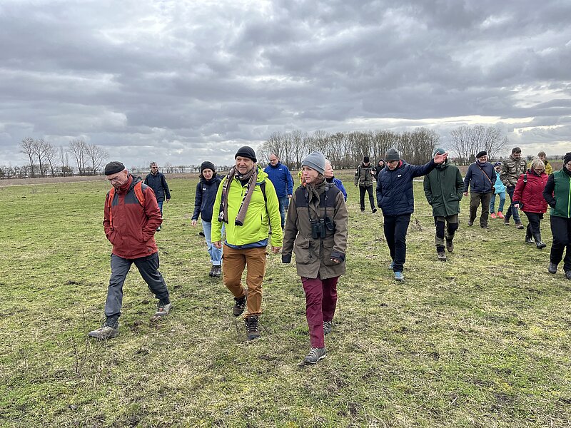 Zusammen mit engagierten Akteurinnen und interessierten BürgerInnen besuchte Thüringens Umweltminister Bernhard Stengele heute die ganzjährig beweidete Moorlandschaft Alperstedter Ried. Die Stiftung Naturschutz Thüringen führte durch das Ried und erläuterte, wie Landentwicklung, Landwirtschaft und Naturschutz hier optimal zusammenwirken und die Wiedervernässung des wertvollen Kalkniedermoores möglich wurde. „Die vernässten Flächen mit ihrer herausragenden Vielfalt an Tieren und Pflanzen werden durch eine ganzjährige naturnahe Beweidung klimaschonend gepflegt und entwickelt.“, so Carlotta Schulz, stellv. Geschäftsführerin der Stiftung Naturschutz Thüringen. Aktuell wurden über 400 Pflanzenarten im Ried kartiert.