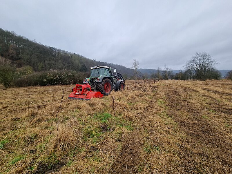 Großburschla liegt am Ufer der Werra, im äußersten Nordwesten des Wartburgkreises und ist seit 1994 ein Stadtteil der Stadt Treffurt. Auf dem ehemaligen Grenzstreifen, dem „Grünen Band“, soll nun wieder eine Schafbeweidung etabliert werden. Hier erfolgte bereits im Sommer eine Beweidung, ebenfalls mit Schafen. Aktuell finden Mulcharbeiten statt, damit der hohe Aufwuchs zurück gedrängt wird. Dafür wurde extra ein Spezial-Mulcher eingesetzt, der die Fläche möglichst schonend behandelt.