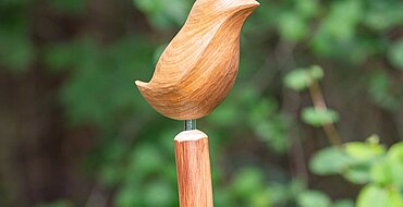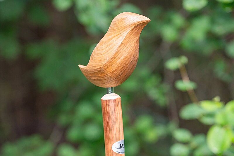 Gefertigt wurde unser Wanderstab in einer Stockmanufaktur aus Lindewerra (Eichsfeld). Er besteht zum einen aus dem Stock, welcher aus dem Holz der Esskastanie gefertigt wurde und zum anderen aus dem Griff in Form unseres Stiftungs-Vögelchens. Dieses wurde aus Vogelbeerbaum (Eberesche) von Hand geschnitzt. Der Stock wurde in der Verarbeitung erhitzt und anschließend gerichtet. Nach dem Trocknen wurde er für eine schöne Musterung mit einem Gasbrenner flambiert, anschließend lackiert und zum Schluss mit der Spitze versehen.