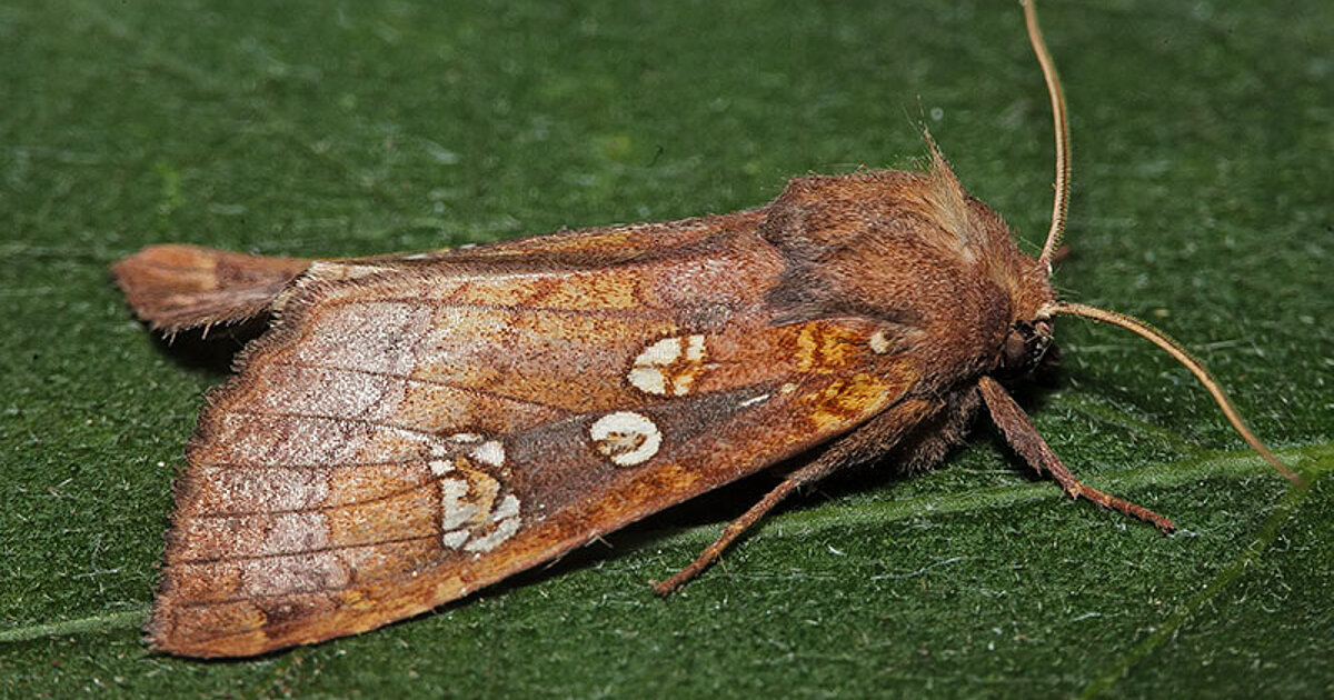 Die Hinterflügel sind beige bis hellgrau mit dunklen Adern. In Ruhepositionen erinnert die Form der Art, wie für Eulenfalter typisch, an ein gleichschenkliges Dreieck.