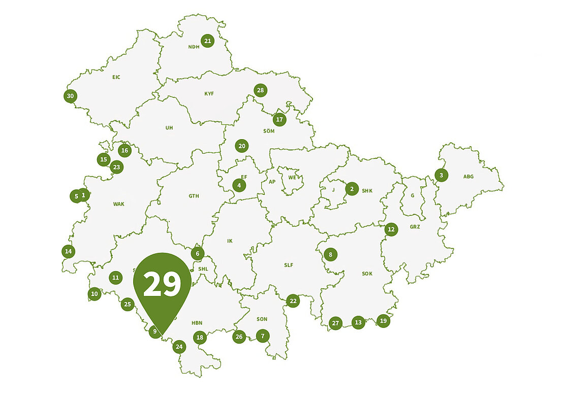 Seit 2007 gab es - mit Ausnahme des Altenburger Landes - in allen Thüringer Landkreisen Nachweise von Bibern. Im Januar 2023 waren 185 Biberreviere in Thüringen bekannt, wobei pro Revier von durchschnittlich drei bis vier Tieren ausgegangen wird. Zu diesem Zeitpunkt waren daher circa 650 Biber in Thüringen ansässig.