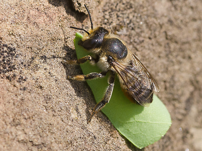 Charakteristisch für die Blattschneiderbiene ist die Bauchbehaarung des Weibchens – die sogenannte Bauchbürste, mit der sie Pollen sammelt. Auch der beim Blütenbesuch oft schräg nach oben abgewinkelte Hinterleib ist typisch für diese Bienengruppe. Mit viel Glück kann man auch beobachten, wie diese Bienen kleine Blattstücke abschneiden, zu ihrer Brutröhre transportieren und dort einbauen.