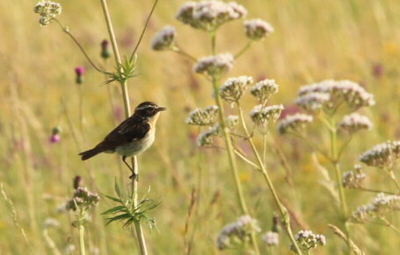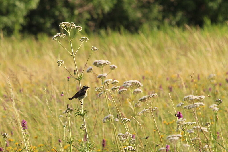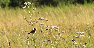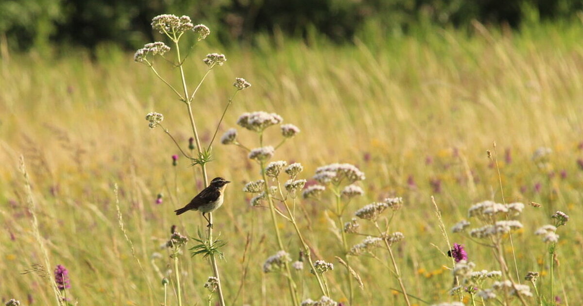 Heute reichen selbst extensiv genutzte Wiesen oft nicht mehr aus. Von acht zoologischen Monitoring-Flächen im Grünen Band konnten wir 2024 nur noch in Mendhausen ein Braunkehlchen-Revier kartieren. Das Vogelmonitoring wird seit 2022 durch ehrenamtliche Kartierer nach der bundesweiten Methode des Monitorings häufiger Brutvögel in Schutzgebieten (MhB-S) durchgeführt. Das hilft uns und dem Deutschen Dachverband Avifaunisten (DDA), die Entwicklung der Arten im Blick zu behalten. Hoffnung für das Braunkehlchen geben große strukturreiche Weidelandschaften.